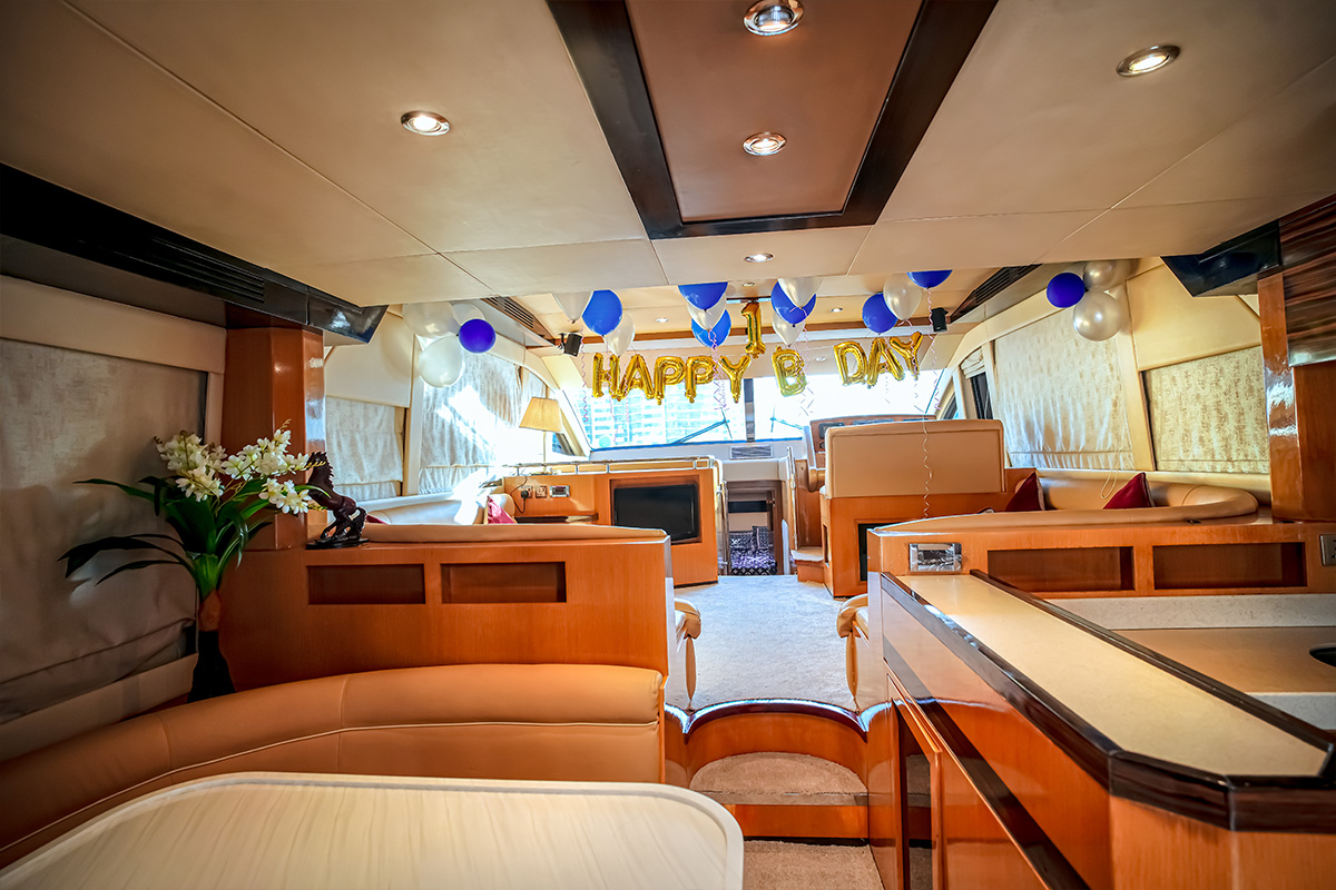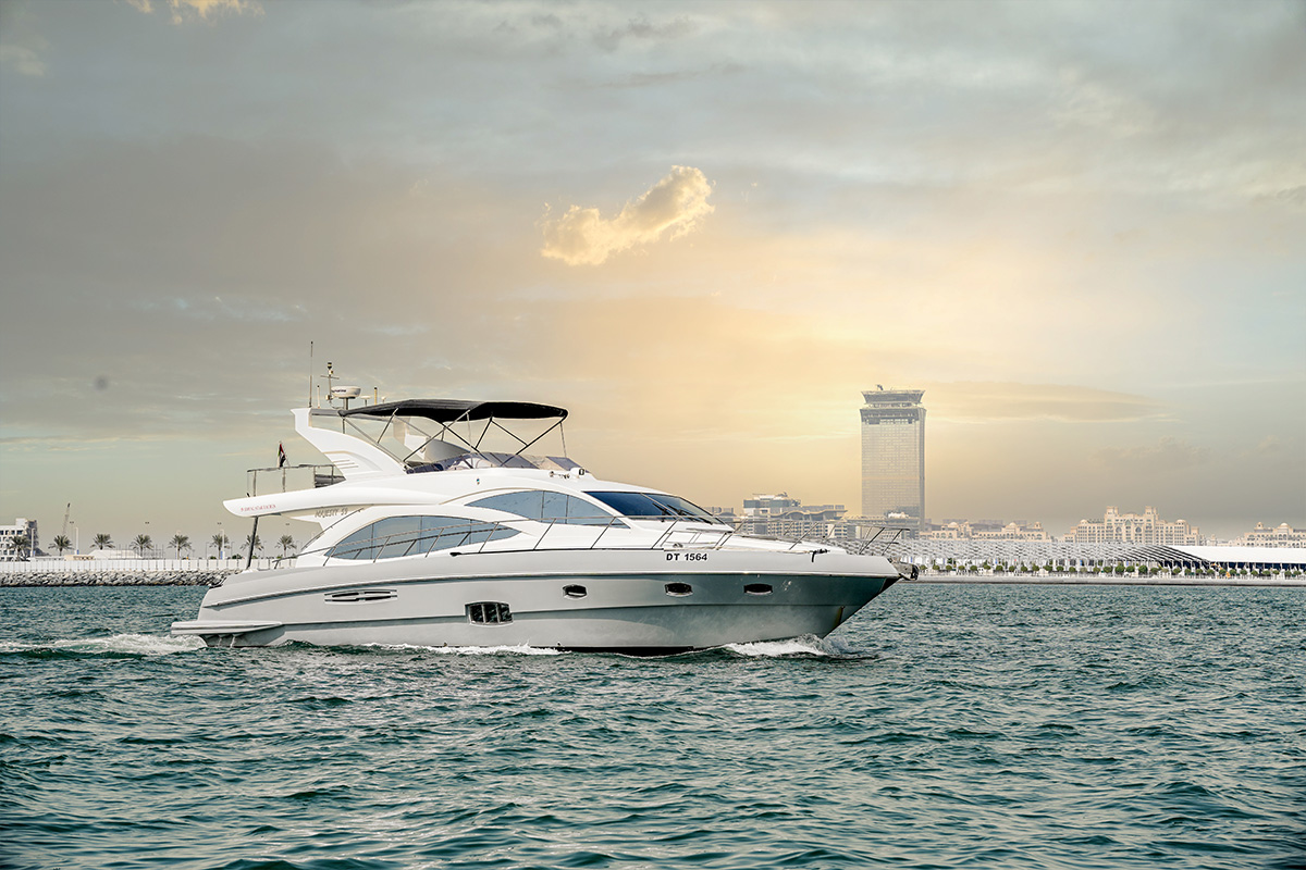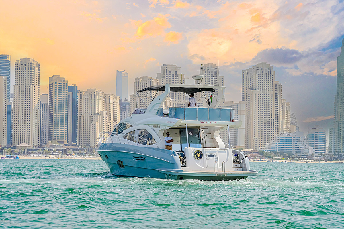Discover the pinnacle of luxury as you glide through the stunning waters of Marina and Palm Jumeirah aboard our Majesty 59-foot yacht, featuring a selection of lavish amenities and unmatched elegance. Experience the peace and calm of the Arabian waters. Whether for special celebrations, events, parties, or unforgettable sightseeing excursions, this impressive 59-foot Majesty yacht caters to 25 guests with utmost luxury. This vessel showcases exceptional artistry, opulent materials, and a sumptuous ambiance on each level, guaranteeing an unparalleled experience. Moreover, our experienced captain and committed crew guarantee an exceptional yachting adventure in Dubai. Secure your yacht bookings now and take advantage of amazing offers!